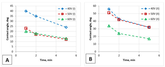 Demonstration of a PAA film’s surface wetting ability (contact angle): the graph for contact angles during the applying of a water drop on the PAA surfaces of the one-stage (A) and two-stage (B) anodized samples.