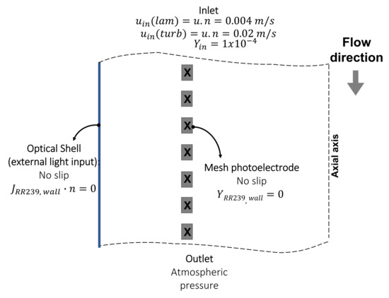 - For all the solid surfaces, the non-slip condition is set. Additionally, a zero mass fraction of RR239 was set at the photoanode, while for the rest of the wall surfaces, a zero diffusive flow rate of the RR39 normal to the frontier is defined.