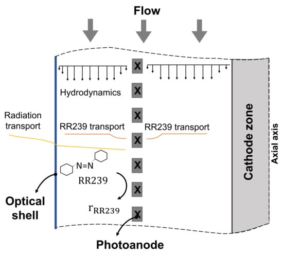 Once the distance is selected, a CFD study of a tubular photoelectrocatalytic reactor is carried out using the selected photoanode configuration, as shown in Figure 4. A 2.7 ratio is used to calculate the cathode area and the empirical photoelectrocatalytic kinetic model (presented in Section 2.1.5) is used for dye consumption at the photoanode surface. Both the area ratio and the kinetics were obtained from [28].