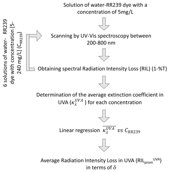 The radiation intensity losses are characterised following the procedure described in Figure 5. First, the transmittance spectrum () for seven water-RR239 dye solutions, with a concentration between 5 and 240 mg/L, is measured by UV-Vis spectroscopy (Termo Scientific Genesys 6, 1 cm cell, 200–700 nm spectrum). Then, based on the values, the for the water-dye concentrations range is estimated.