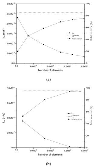 In order to validate the solution methods presented in Section 2, a mesh independence study was carried out. Figure 6 shows the results for a reference case study with a fixed value for the electrode mesh aperture w equal to 0.6 cm and a distance of 1 cm. The mesh independence study was developed for both electrode geometries described in Section 2.4 under laminar and turbulent flow conditions, but only the laminar regime result is shown. It is important to mention that the mesh independence study was carried out only by varying the size of the computational mesh. It is observed from the results for the WME (Figure 6a) and EME (Figure 6b) electrodes that meshes within 13 and 15 million elements present a relative error lesser than 10% in both cases (square symbol). Additionally, a convergent behaviour (triangle symbol) towards the value of the mass transfer coefficient obtained by Richardson extrapolation (dotted line) is observed; a similar behaviour was previously observed for other surface coefficients, such as the convective heat transfer [34].