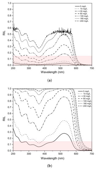 It is worth mentioning that Equation (30) is applied for each wavelength and specific dye concentration, allowing the evaluation of the between 200–700 nm, different RR239 concentrations and (i.e., 0.1, 0.4 and 1 cm). In this way, a weighted average extinction coefficient in the UVA wavelength spectrum for each concentration value of RR239 (, 315–380 nm), is obtained as