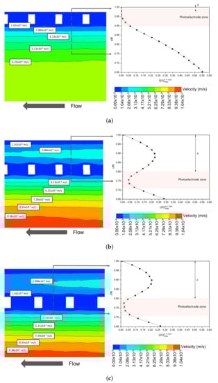 Figure 10 shows the velocity contour plots and velocity magnitude profiles for the WME geometry with of 0.1 (Figure 10a), 1 cm (Figure 10b), and the velocity contour for the EME geometry with of 1 cm in Figure 10c. The velocity profiles are normalised for the maximum velocity in the WME and of 1 cm (). It is observed that for a value of equal to 0.1 cm, a stagnant zone is created with low velocities (<1.42 × 10 m/s, in dark blue colour) between the optical shell and photoelectrode (it was also observed for equal to 0.4 cm), which would not benefit the mass transfer velocity due to diffusion limitation. This tendency is observed in both electrode geometries under laminar and turbulent regimes. Therefore, with a = 1 cm, an increase in velocity is attainable, reducing the flow stagnation.