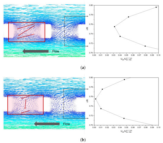 It is important to emphasise that with the WME geometry, higher velocities are generated in the photoelectrode zone (pink box in the axial velocity profile of Figure 10) for of 1 cm, compared to EME. This could be due to higher levels of micromixing in the WME geometry as a consequence of the hydrodynamic profile shape in the vicinity of the electrode. Figure 11 shows the velocity vectors with equal to 1 cm and w of 0.6 cm, for WME (Figure 11a) and EME (Figure 11b). It is observed that in the mesh aperture, the hydrodynamic profile of WME is Z-shaped, and the EME is I-shaped, generating a higher axial fluid velocity in this area for the WME (three times greater than EME), as shown in the axial velocity profiles on the right side. In addition, the Z-shaped profile in the WME geometry generates a kind of shock towards the electrode surface, which could reduce the thickness of the boundary layer of the mass fraction of RR239.