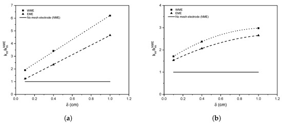 Based on the species transport modelling, it was determined that increasing the value of w makes the mass transfer coefficient longer, which corresponds with the previously hydrodynamic characterisation analysis. This tendency was more evident in the WME geometry; however, a w of 0.6 cm was chosen in both geometries to perform the analysis varying . Figure 12 shows the relation of for a reactor with mesh electrode WME and EME, concerning the in the same reactor without a mesh electrode, calculated under the laminar regime (Figure 12a) and turbulent regime (Figure 12b) all in terms of . The reported values were obtained with the Richardson extrapolation.