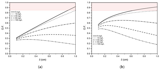 Figure 13a,b shows the objective function behaviour for laminar and turbulent flow using a WME configuration, respectively. The objective function for the laminar and turbulent flows shows a trend defined by the in both hydrodynamic regimes. It is possible to obtain objective function values close to 1 (high mass transfer rate and low ) for RR239 concentrations less than 10 mg/L in both laminar and turbulent regimes. However, when the concentration of RR239 is greater than 30 mg/L, there is a substantial limitation by the when increasing . In this regard, it is observed that there is a maximum value of the objective function for equal to 0.8 and 0.4 cm for 30 mg /L in the laminar and turbulent regimes, respectively. However, when the RR239 concentrations are greater than 60 mg/L, it forces the use of smaller values due to the strong limitation by the , which decreases the rate of mass transfer.
