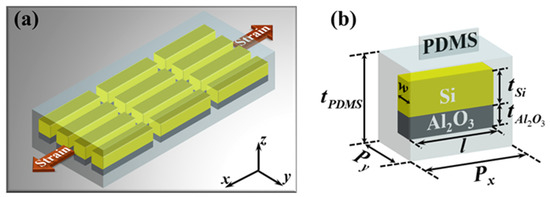 The schematic of the proposed metasurface is shown in Figure 1a, which is composed of an array of nanoblocks embedded in a PDMS substrate. PDMS, a flexible material with lower optical loss and remarkable elasticity, has been widely used in mechanically reconfigurable metasurfaces [29,30,31,32,33,34,35,36]. The unit cell of the metasurface is depicted in Figure 1b. It consists of a silicon (Si) rectangular cross-sectional nanoblock on a thin layer of aluminum oxide (Al2O3) embedded in PDMS substrate. The width w and length l of Si and Al2O3 is 80 nm and 370 nm, respectively. The thickness of Si and Al2O3 are fixed as tSi = 110 nm and tAl2O3 = 50 nm. The thickness of PDMS substrate is denoted as tPDMS, the periods of the unit cell along the x and y-directions is Px and Py, respectively. Since the Young’s modulus of Si and Al2O3 are much larger than that of PDMS, Si and Al2O3 can be regarded as rigid materials during the stretching process. Thus, when the flexible substrate is mechanically stretched, the deformation of PDMS substrate will cause the physical distance between the nanoblocks, that is, the period of the metasurface, to change, while the optical constants and geometry of the nanoblocks remain unchanged. The numerical simulation is performed by three-dimensional finite-difference time-domain (FDTD) models. An x-polarized plane wave at a wavelength of 532 nm is normally incident from the bottom of PDMS substrate. The optical constants of Si and Al2O3 are taken from Ref [44] and the refractive index of 1.41 is used for PDMS. Perfectly matched layers in the z-direction and periodic boundary conditions along the x- and y-directions are applied in the simulation. In an unstrained state, the periods of the metasurface along the x and y-directions are set as Px0 = 450 nm and Py0 = 120 nm, the thickness of PDMS substrate is t0 = 3300 nm.