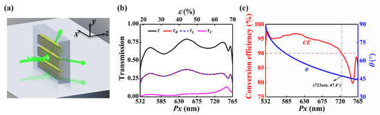 When the period Px is greater than the operating wavelength of 532 nm, the working mode of the metasurface changes. According to Equation (2), the diffraction phenomenon will occur when the period Px is greater than the wavelength. In our previous study [43], it has been confirmed that such uniform metasurfaces possess efficient and broadband beam-splitting performance as shown in Figure 5a. After passing through the metasurface, the incident light is divided into three parts that propagate along the left side (negative x-axis direction) of the normal, the right side (positive x-axis direction) of the normal, and the normal direction. For beam splitters, conversion efficiency (CE), defined as CE = (TL + TR)/T × 100%, is one of the key factors to measure the beam splitting performance. We define that when the conversion efficiency is higher than 90%, the metasurface exhibits efficient beam splitting performance. Figure 5b depicts the transmission intensity of the three parts of the outgoing light and the total transmission when Px varies from 532 nm to 765 nm (ε = 70%). The elastic limit of PDMS is around 200% [50], so a period Px of 765 nm is achievable by stretching the PDMS substrate. It can be seen that TR and TL are always the same at any wavelength. According to Equation (2), the angle between the emergent light beams propagating on the left and right sides of the normal and the normal direction is the same, which we define as the splitting angle θ. Figure 5c depicts the conversion efficiency CE and splitting angle θ of the metasurface when the period Px increases from 532 nm to 765 nm. The conversion efficiency remains higher than 90% within the period Px region from 532 nm to 723 nm, where the splitting angle varies from 90° to 47.4°. Thus, the device operates as an efficient dynamic equal-power splitter (Behavior-ΙΙΙ) when the period Px varies from 532 nm to 723 nm, the corresponding working mechanism is depicted in Figure 5a.