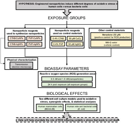 Experimental design showing exposure variables to determine induced reactive-oxygen-species (ROS) generation in bacteria and mammalian cells after nanoparticle exposure.