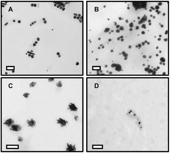 Transmission electron microscopy (TEM) images of surface-stabilized silver and copper nanoparticles. (A) CTAB-AgNPs (B) PVP-AgNPs (C) CTAB-CuNPs (D) PVP-CuNPs. Scale bar represents 100 nm.
