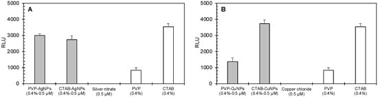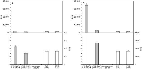 Effects of nanoparticle systems on ROS generation by E. coli bacteria cells exposed to surface-coated nanoparticles and their component chemicals. Panels show the relative luminescence units resulting from the ROS-Glo™ H2O2 Assay of E. coli cells exposed to (A) surface-coated silver nanoparticles and their components and (B) surface-coated copper nanoparticles and their components. Error bars depict one standard deviation from the mean. The assay was validated using menadione as a positive control for ROS production in bacterial cells; its RLU value was 3650.
