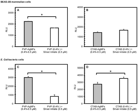 Comparison of the effects of surface-stabilized silver nanoparticles (measured) to the predicted cumulative effects of stabilizing agents and silver nitrate as calculated from independent component treatments. The graphs show the average RLU generated by treatment of BEAS-2B mammalian cells (A,B) and E. coli bacterial cells (C,D) with PVP-AgNPs (0.5 µM; (A,C)) and CTAB-AgNPs (0.5 µM; (B,D)). Error bars depict one standard deviation from the mean. Significantly different means are indicated by an asterisk (p < 0.05).