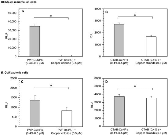 Calculated (effects of stabilizing agents plus effects of copper chloride) versus measured (surface-stabilized copper nanoparticle) relative luminescence units (RLU). The different copper nanoparticles (0.5 and 1.0 µM PVP-CuNPs and 0.5 and 1.0 µM CTAB-CuNPs) against (A,B) BEAS-2B mammalian cells and (C,D) E. coli bacterial cells. In each panel, the measured RLU is presented as the average of triplicate measurements, and the error bar shows the standard deviation; the asterisk indicates that the measured RLU was significantly lower than the calculated RFU (p < 0.05), indicating a consistent synergistic effect for PVP-CuNPs in both mammalian and bacterial cells (except for 0.5 nM PVP-CuNPs, where the results are equivalent) and contradicting effects for CTAB-CuNPs in mammalian cells (antagonistic effect) versus bacterial cells (synergistic effect). Black asterisks indicate that the surface-stabilized copper nanoparticle is significantly higher in RLUs than the 0.4% stabilizing agent plus 50 µM copper chloride co-exposure. Red asterisks indicate that the surface-stabilized copper nanoparticle is significantly lower in RLUs than the 0.4% stabilizing agent plus 50 µM copper chloride co-exposure.