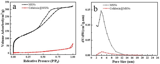 The results of the nitrogen adsorption–desorption isotherms of MSNs and Cefalexin@MSNs are shown in Figure 3. The adsorption isotherm is recognized as a representative type-IV isotherms, and an obvious capillary condensation step and hysteresis loop can be observed around the relative pressure (P/P0) between 0.25 and 0.8, indicating mesoporous structure and wide pore size distribution (Figure 3a). However, there is no obvious change in the average pore diameter around at ~4 nm for either MSNs or Cefalexin@MSNs, as shown in Figure 3b. As summarized in Table 2, the BET surface area, the total pore volume, and the average pore diameter of the MSNs are 593 cm2 g−1, 0.64 cm3 g−1, and 4.1 nm, respectively. However, these parameters greatly decrease to 28 cm2 g−1, 0.03 cm3 g−1, and 3.9 nm, respectively, for Cefalexin@MSNs, indicating that the cefalexin has been successfully incorporated into the pores of MSNs.