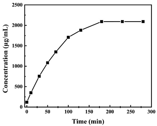 The slow-release curve of the Cefalexin@MSNs is drawn according to Formula (1). It can be seen from Figure 4 that the concentration of cefalexin in deionized water continues to increase with the increase in time. In the first 100 min, the release rate of cefalexin is fast. Over the range of 100–180 min, the release rate decreases. After 180 min, concentration remains basically unchanged, indicating that all the cefalexin loaded in the MSNs has been released. It can be seen that the slow release of cefalexin is achieved by loading the cefalexin into the mesoporous material MSNs.