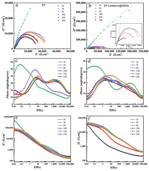 The results show that the EP-Cefalexin@MSNs coating and the pure EP coating have similar properties but have significant differences. The Rc value of the EP-Cefalexin@MSNs coating at the initial stage of immersion is much greater than that of pure EP. This is because the added MSNs increase the physical barrier effect of the coating. In addition, the Rct value for 6 h (90,659 Ω cm2) immersion is higher than that for 3 h (88,067 Ω cm2) immersion. During the 3–10 h of immersion, the rate of change of the Rct value of the EP-Cefalexin@MSNs coating is very slow. This is attributed to the release of cephalexin from the MSNs as the increase of immersion time, inhibiting the corrosion of SS. When immersed for 24 h, the Rct value of the EP-Cefalexin@MSNs coating decreases to 58,961 Ω cm2 but is still much higher than that of the EP coating, which indicates that EP-Cefalexin@MSNs has more long-term corrosion resistance.