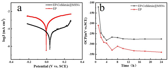 Tafel curves (a) and OCP (b) of EP and EP-Cefalexin@MSNs in 3.5 wt.% NaCl solution.