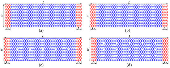 Figure 1 shows the atomic structures of defective graphene nanoribbons with length L = 10.365 nm, thickness h = 0.335 nm, and width W = 3.24 nm, including (a) perfect sheet, (b) single vacancy, (c) low-concentration vacancies, and (d) high-concentration vacancies SLGSs. Three layers at both ends, colored in red, of all the SLGSs are fixed, while the rest are free parts that are colored in blue. A periodic boundary is used in the X and Y directions, and a shrink-wrapped boundary is used in the Z direction.