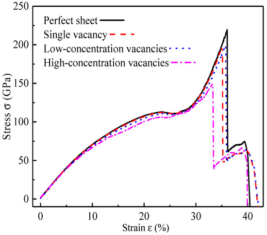 Tensile stress-strain curves of SLGSs with different vacancy concentrations.
