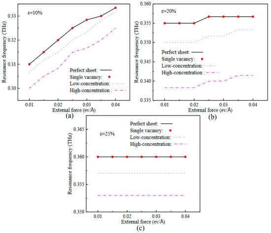 Considering the period of the conversion between kinetic energy and potential energy as T, the vibrational period should be 2T. Frequency response curves can be obtained through Fast Fournier Transform (FFT) by selecting the kinetic energy of the systems as time-domain signals. Figure 4 gives the frequency response curves of the SLGSs with different vacancy concentrations under (a) ε = 10%, (b) ε = 20%, and (c) ε = 25% pre-strained conditions. For all these different kinds of defective SLGSs, the external force influences the frequency responses of SLGSs with 10% pre-strained the most and affects the frequency responses of SLGSs with 25% pre-strained the least. In other words, the vibration properties of SLGSs during the elastic stage are the most sensitive to the external load. It is noted that the frequencies shown in Figure 4 are twice the resonance frequencies of corresponding systems.