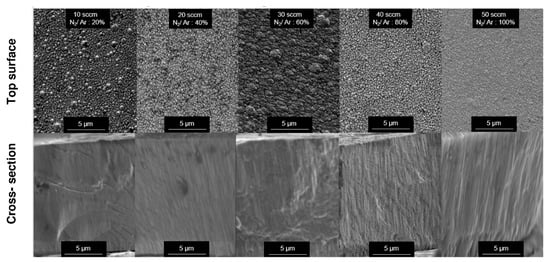 Regarding the application of different nitrogen flow rates (10, 20, 30, 40, and 50 sccm) and the addition of 2 at.% yttrium on the microstructure, the following conclusions can be drawn: