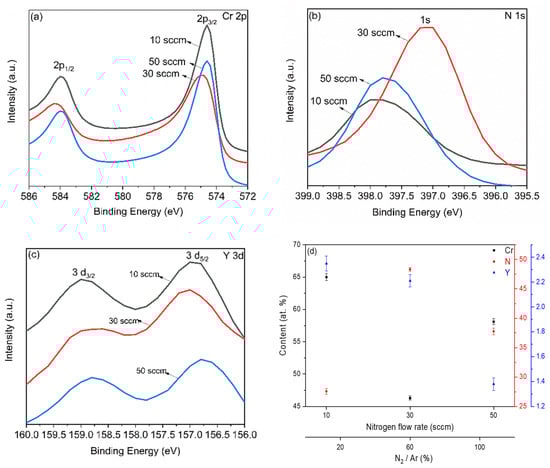 Figure 5b shows the spectra of N1s, and there is a single broad peak with significant variations in peak intensity. The N2 flow rate of 30 sccm leads to maximum nitrogen content, while 10 sccm promotes a minimum and 50 sccm, an intermediate nitrogen concentration. The N1s peaks lie at about 397.4 eV for all nitrogen flow rates, i.e., 10, 30, and 50 sccm. This binding energy is associated with the transition metal nitride CrN, exhibiting the theoretical peak at 396.7 eV. The lower binding energies for 10 and 50 sccm can be attributed to the increased distance between the Cr, Y, and N atoms and the decreasing atomic bonding. The N atoms can be placed in positions previously occupied by the Cr atoms [6,29]. For the Y3d spectra (Figure 5c), two peaks, 3d3/2 and 3d5/2, slightly shifted. The 3d3/2 and 3d5/2 binding energies lie at approximately 158.8 and 156.6 eV, respectively, compared to the theoretical values of 160 and 158 eV. This small energy shift is due to the (Cr, Y)Nx coatings bond [30,31].