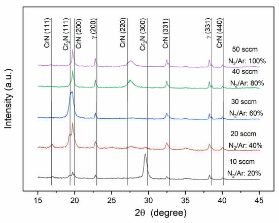 The properties of coatings can be modified by changing HiPIMS process parameters such as bias polarization, working pressure, gas ratio, substrate displacement, and impinging angle of ion bombardment [9,16,17,18,19,20,21]. The microstructure, mechanical and tribological behavior are strongly related to N2/Ar flow ratios during deposition. Different nitrogen contents cause changes in the crystal lattices and width of the constituent columns growing perpendicular to the substrate [22,23]. CrN coatings exhibit interesting electrical and magnetic properties due to semiconductor behavior and magnetic ordering, thus becoming a promising coating in magnetic semiconductor thinner applications [6,22,24,25,26].