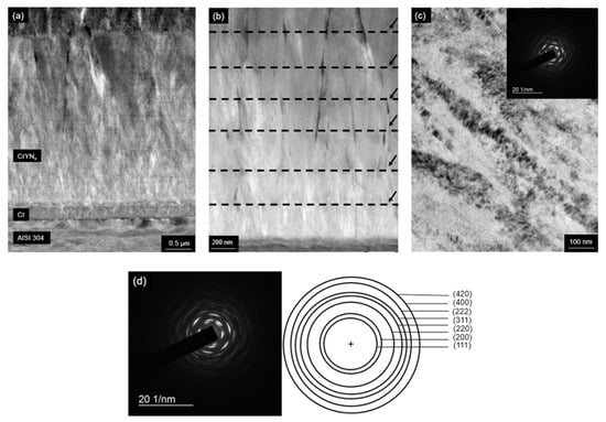 The High-Angle Annular Dark-Field Scanning Transmission Electron Microscopy (HAADF-STEM) image of the cross-section shows the morphology of the Cr base layer and the (Cr, Y)Nx films with a highly segmented columnar structure (Figure 7a). Figure 7b shows (Cr, Y)Nx multilayer nanostructure with N2 flux of 50 sccm. So that Figure 7b shows that columnar grains exhibit a zig-zag grain growth morphology (black arrows) that is consistent across multiple layers. Bright-Field Transmission Electron Microscopy (BF-TEM) image of the nanostructured film grown with a nitrogen flow rate of 50 sccm and oscillatory motion of the substrate also shows the columnar feature of the deposition (Figure 7c). The Selected Area Electron Diffraction (SAED) patterns of the (Cr, Y)Nx films confirm the formation of nanosized grains that generate the rings in the Diffraction Patterns (DPs), as shown in Figure 7d. Figure 8b–e shows schematic illustrations of the crystal structures of the Cr2N, CrN, Cr, YN, and Y phases. The CrN based coatings are characterized by their fine granulation and dense structure, and the thickness of the coatings is related to peak voltage, which corroborates the (Cr,Y)Nx coatings in that increasing the nitrogen flux increases the thickness of the coating by increasing the peak voltage [20].