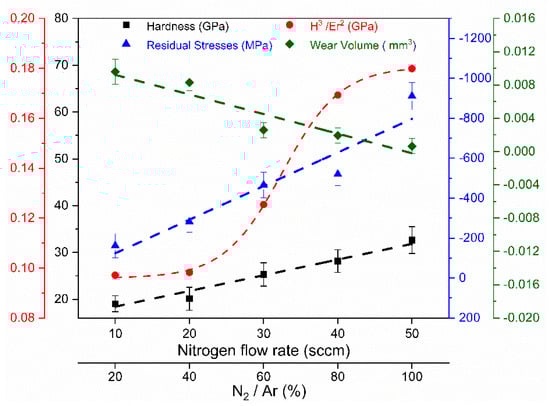 Figure 10 shows the mechanical and tribological properties from which it is possible to observe an evolution of the residual stresses in the multilayer-like (Cr, Y)Nx coatings deposited by HiPIMS as a function of N2 flux. All coatings exhibited compressive residual stresses. By increasing the N2 flow rate from 10 to 50 sccm, residual stresses increased (from −162 to −911 MPa). Residual stresses in magnetron-sprayed coatings often arise due to intrinsic growth and thermal stresses [27]. The compressive stresses gradually grew with increasing nitrogen content because of rising negative peak voltages. Hence, incorporating nitrogen in the coatings at a higher flow rate can effectively reduce surface roughness and cone-shaped defects and increase the compressive stresses.