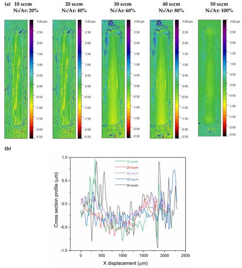 Figure 11 displays the wear tracks of (Cr, Y)Nx coatings generated by the dry linear reciprocating wear test, as measured by non-contact optical profilometry. All (Cr, Y)Nx coatings grown with different nitrogen flow rates showed material accumulation at the edges. The most significant wear track depth is for 10 sccm flow. As the flow of nitrogen increases, the maximum depths tend to decrease. The lowest maximum depth is for (Cr, Y)Nx films manufactured with a flow rate of 50 sccm [41]. Moreover, the grooves in the lower region of the indicative abrasive wear ranges are also notable.