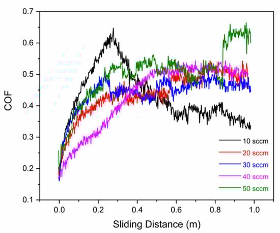 When analyzing the friction coefficient of the (Cr, Y)Nx films, it is notable that the nitrogen flow of 30 sccm showed a rapid and sharp increase in the initial cycles, as shown in Figure 13. Coatings produced with a nitrogen flow of 10, 20, 40, and 50 sccm initially show a similar trajectory, with the coefficient of friction rising slower. However, for 10 sccm, there is a significant decrease in the friction coefficient. For flows of 20 and 40 sccm, the friction reaches a steady-state, while the coefficient of friction for the 50 sccm condition reaches a maximum steady-state value after a second gradual increase at the end of the cycle.