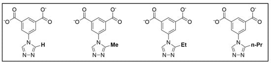 Illustration of organic linkers for the MOFs Cu-IH-pw, Cu-IHMe-pw, Cu-IHEt-pw, and Cu-IHnPr-pw from left to right. The differences are within the alkyl side-chain in the 2-position of the triazolyl ring.