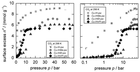 Classical adsorption isotherm in linear (left) and logarithmic (right) representation for the CO2-adsorption at 298 K for Cu-IH-pw, Cu-IHMe-pw, Cu-IHEt-pw, and Cu-IHnPr-pw, showing a decrease in sorptive loading in dependence of the linker size. Graphic adapted from Kobalz et al. [26].