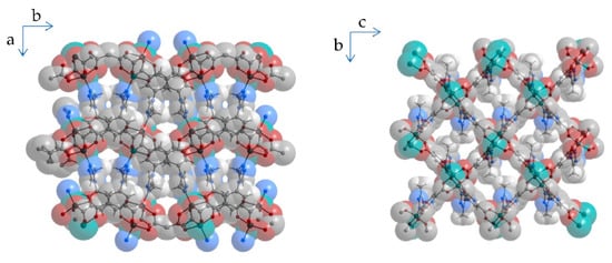 As previously reported for CO2 adsorption [26], Cu-IH-pw shows no flexible behavior while Cu-IHMe-pw demonstrated two, Cu-IHEt-pw and Cu-IHnPr-pw one structural transition, making it a well-suited MOF series for the investigation of sorptive switching behavior (see Figure 2). Therefore, at least three concurring structures are existent in the flexible MOFs, herein called narrow pore, medium pore, and large pore form (np, mp, and lp form, respectively). For Cu-IHMe-pw, the largest cavities in the respective structure np and mp are shown in Figure 3. For further details on the structures, please see the Supplementary Materials, Section S4.