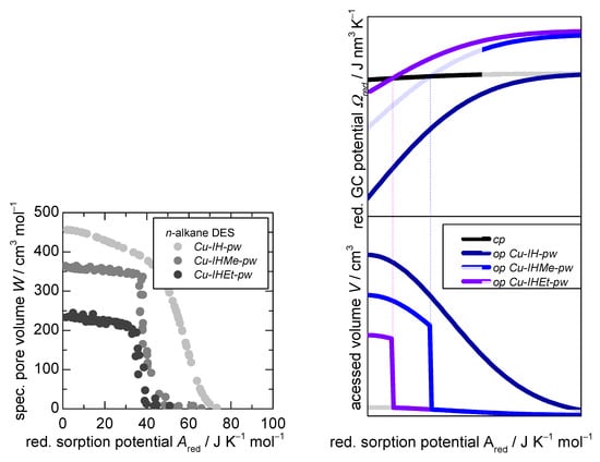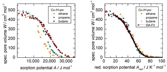 Using a chemically different adsorptive such as iso-butene, the reduced isotherms do not converge into the same characteristic sorption pattern, as shown in Figure 5 (left). While iso-butene sorption isotherms display the same overall shape and it reaches a similar total accessed pore volume , the pattern is shifted to a higher reduced sorption potential . As established in the literature, every sorption potential corresponds to a specific differential heat of adsorption [32] and thus the enthalpic interaction of solid and adsorptive is scalable with as well, if a complete coincidence of all isotherms is observed. This can be seen in Figure 5 (right), where a value of 100 as reduced differential heat of adsorption for the n-alkanes on Cu-IH-pw at half coverage can be derived via the dual Dubinin–Asthakov fit and the Clausius–Clapeyron equation [32]. For the case of a rigid adsorbent, the shift to higher reduced sorption potentials of the characteristic curve can only be explained with a higher interaction potential between solid and gas or vice versa. In the case of iso-butene and its double bond, it is possible that it can interact specifically with the systems of the triazolyl or the isophtalate ring structures of the rigid MOF and thus has a higher reduced differential heat of adsorption (108 at half coverage).