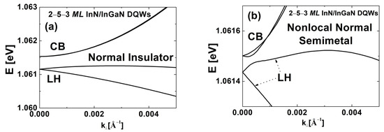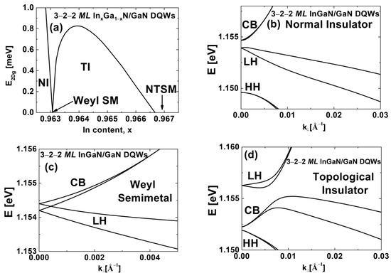 First, we investigated InxGa1-xN/GaN DQWs with , , and , which were grown on conventional GaN substrates. In Figure 2, we show the bulk energy gap, , and the subband dispersions for four distinct phases occurring in these structures. Figure 2a presents the as a function of the In content in the QWs. As in the case of single InxGa1−xN/GaN QWs [13,20], we observed the TPT and the NTPT, which were accompanied by the closing of . In a more detailed analysis, we observed that when the In content of the QWs, x, is below 0.96307, the DQW system is in the NI phase with the usual ordering of sub-bands (see Figure 2b). We would like to note that due to the negative SOI of InN, the highest light-hole (LH) sub-band with the symmetry is above the highest heavy-hole (HH) sub-band with the symmetry [13]. The names of the subbands reflect the dominant contribution of the CB, HH, and LH states around [19]. As the value of x increases, the energy gap of InxGa1−xN alloys decreases toward the bandgap of InN and, more importantly, the built-in electric field in the QWs increases, causing an inversion of the CB and LH sub-bands and the TPT from the NI to the TI (see Figure 2d). The TPT is mediated by the Weyl semimetal (WSM) (see Figure 2c) because the CB and LH sub-bands anticross at [13]. The amplitude of compressive in-plane strain in the QW layers at the TPT, denoted by , is about 9.71%. In the TI phase, the reaches a maximum value of . For x values larger than 0.96667, the vanishes due to the NTPT from the TI phase to the NTSM, arising from nonlocal overlapping between the sub-bands, as shown in Figure 2e [13,20].