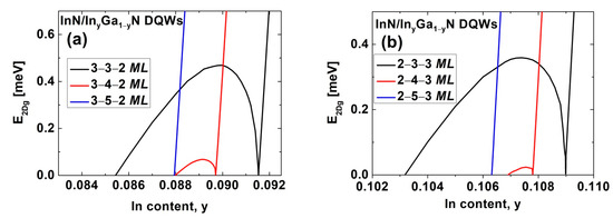 We considered InxGa1−xN/GaN and InN/InyGa1−yN DQWs with the widths of individual QWs, , and , equal to two and three MLs, three and two MLs, and three and three MLs. We found that TPT can occur in these structures. On the other hand, in thinner DQWs, i.e., when and , the QCSE is too weak to induce the TPT, and only the NI phase appears. We assumed that the thickness of the external barriers (see Figure 1) is large, i.e., , because this makes the built-in electric field in QWs extremely large and the TPT easier to achieve [13].