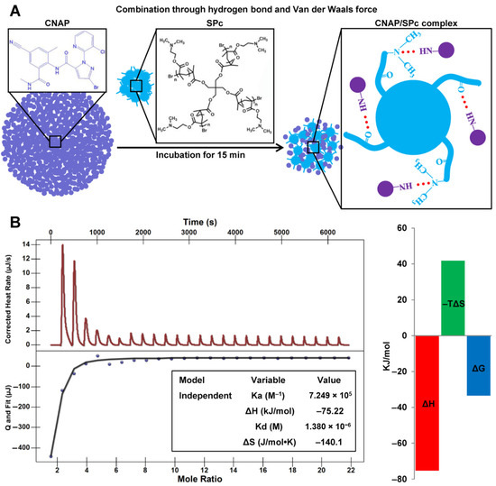 The 1 mL of CNAP (0.0138 × 10−3 mol/L) was titrated with 250 µL SPc water solution (1 × 10−3 mol/L) in Nano ITC (TA Instruments Waters, Newcastle, DE, USA). The heats of interaction during each injection were calculated by integrating each titration peak using the Origin software v. 7.0 (OriginLab Co., Northampton, MA, USA). The test temperature was 25 °C, and ΔG was calculated using the formula of ΔG = ΔH − TΔS.
