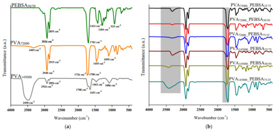 (a) PEBSA50/50, PVA72000 and PVA145000 cryogel; and (b) PVA72000_PEBSA25/75, PVA72000_PEBSA50/50, PVA72000_PEBSA75/25, PVA145000_PEBSA25/75, PVA145000_PEBSA50/50 and PVA145000_PEBSA75/25 cryogel spectra.