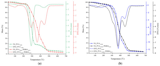 (a) The TG and DTG curves of the PVA72000_PEBSA50/50 cryogel and (b) the TG and DTG curves of the PVA145000_PEBSA50/50 cryogel.