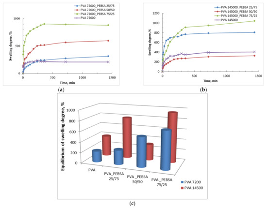 Degree of swelling vs. immersion time (min) for different composition PVA/PEBSA cryogels: (a) MwPVA = 72,000 Da, (b) MwPVA = 145,000 Da and (c) comparison between the samples regarding the maximum swelling degree.
