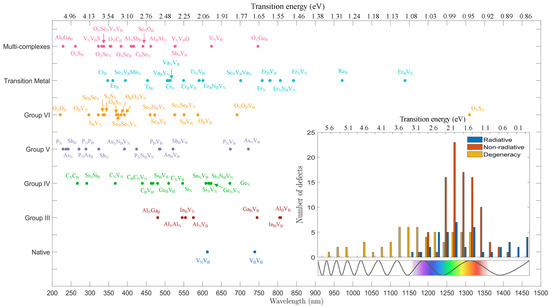 Distribution of optical transition energies (neutral charge states) of identified defect complexes in the optical spectrum. The defects have been classified according to the position in the periodic table of the involved impurities. The inset shows a histogram (with a bin width of 0.25 eV) of all 205 investigated (neutral) defects classified in their transition type (radiative, non-radiative, and degenerate). Note that in this article V denotes a vacancy, while for the chemical element vanadium the symbol Va is used.