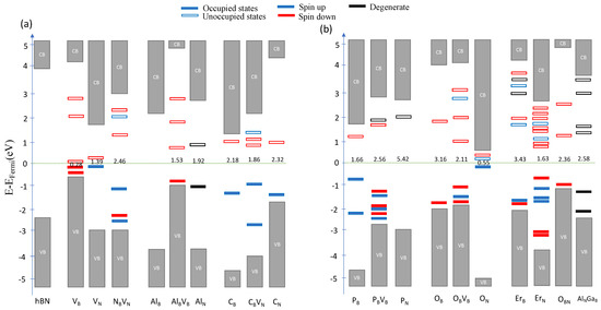 - Huang, B.; Lee, H. Defect and impurity properties of hexagonal boron nitride: A first-principles calculation. Phys. Rev. B 2012, 86, 245406. [Google Scholar] [CrossRef]