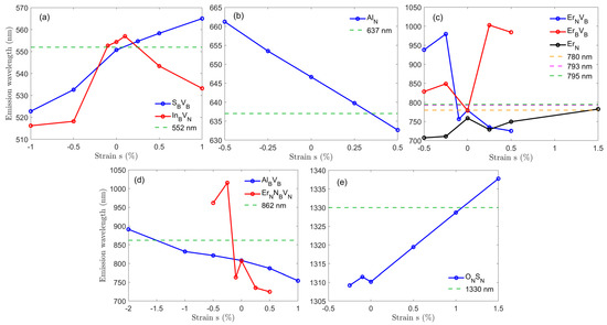 Emission wavelength as a function of bi-axial strain. The dashed lines mark the target wavelength and solid lines represent the emission wavelength of the defects at (a) 552 nm (PbV in diamond), (b) 637 nm (NV in diamond), (c) 780 nm (Rb-D2), 793 nm (Tm:YSiO), and 795 nm (Rb-D1), (d) 862 nm (V in silicon carbide), and (e) 1330 nm (telecom O-band).