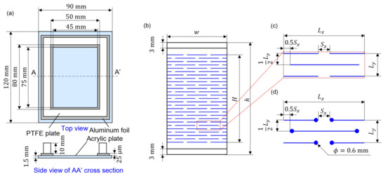 Schematic diagrams of (a) the aqueous CNF dispersion container to dry the CNF dispersion, and (b–d) Kirigami structures: (b) The specimen with a cut pattern of staggered dashed lines (or “Amikazari) is represented by the blue lines. (c) The pattern consists of a unit where the specific set of , , , and H determines the pattern, whereas w and h determine the size of specimen. The gaps of 3 mm on each side of the specimen are in direct contact with the chucks of the tensile testing system. (d) Basic and versatile design variation of the Kirigami pattern with the round-edge cutting line is schematically shown. It should be noted here that the design is based on the center lines of a laser processing trajectory and the actual cut lines include round edges have finite widths.