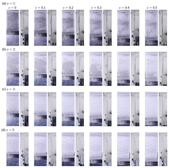 Sequential snapshots in the tensile loading to without iteration (i.e., ) for different scale parameters s. Six sets of subfigures in each of (a–d) show the strain , and 0.5 from left to right. A unit pair of subfigures for a specific strain value indicate the top and side views of the specimen. The scale bars indicate 10 mm.