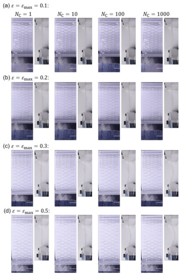 Sequential snapshots in the iterative tensile loading cycles of specimens with for different maximum strains . Four sets of subfigures in each of (a–d) show the number , and 1000 of tensile loading cycles, respectively—from left to right. A unit pair of subfigures for a specific indicate the top and side views of the specimen. It should be noted that top views correspond to the state of whereas the side views correspond to the original end-to-end distance state. The scale bars indicate 10 mm.