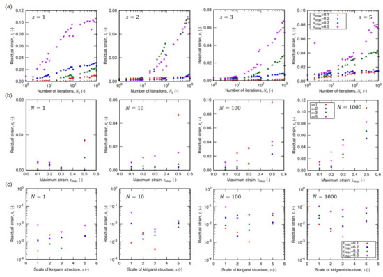 Figure 2 and Figure 3 are the sequential snapshots of the actual specimen in the tensile tests. Figure 2 shows the first cycle of the tensile load to for different unit scales s of Kirigami structure (cf. Section 2 for definition), and Figure 3 shows the iterative process for different for . Figure 4a shows the residual strains as a function of the number of cycles in the iterative tensile test. The subfigures indicate the variation of the unit scale s of the Kirigami patterns. The high mechanical resilience of nanopaper implemented with Kirigami functionality can be observed in this figure. The residual strain for a single cycle of tensile test shows and cycles of the loading keeps against . Figure 4a also reveals that the moderate maximum strain (i.e., ) shows remarkably higher resilience compared to the harsh conditions (i.e., ). There is an overall feature that the iteration of elongation and restoration to the initial end-to-end distance of the specimen cause the increase in residual strain. In addition to , the maximum strain shows a clearly positive correlation with the residual strain, which is further confirmed by Figure 4b. The dependence of on manifests when the loading is iterated.