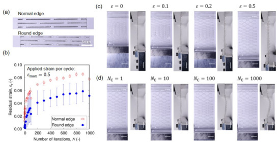 The characteristics of Kirigami design based on the cut lines with round edges: (a) Digital camera images of cut lines based on the sharp edge and the round edge on nanopapers. (b) Comparison of residual strain by Kirigami patterns with round edge and normal edge. The scale of Kirigami patterns is and the maximum strain is . The error bars indicate the maximum and minimum values in the three trials of different specimens. (c,d) Sequential snapshots in the tensile tests of Kirigami patterns with round edges with scale parameter , where (c) the tensile loading to without iteration (i.e., ), and (d) iterative tensile loading cycles with . The unit pair of subfigures for a specific strain value in (c,d) indicate the top and side views of the specimen. It should be noted that side views in (c) indicate the tensile state and those in (d) indicate the state of the original end-to-end distance, while top views in (d) indicate the state of . The scale bars indicate 10 mm.