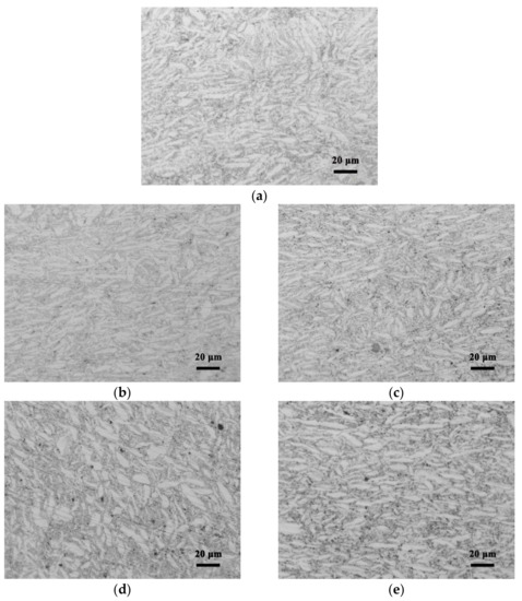 Figure 4 shows the microstructure of composites sintered with different CNT contents. It can be seen that most grains are thin strips with a length of about 20 μm and a width of about 4 μm, which is similar to the refined AZ61 particles (Figure 2b). Compared with the grain size of 80 μm in the original AZ61 powder, the grain size of the composite decreased significantly after ball milling. In addition, there are a small number of fine grains smaller than 3 μm, which are produced by the fine particles broken during the ball milling process (Figure 3). The grain morphology has little change with the difference of CNT content. However, with higher CNT content, the black spots in the microstructure increase, which corresponds to the CNT clusters in the mixed powder (Figure 3).